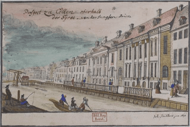 Die Brücke oder vielmehr der Übergang ermöglichte es, den Kanal der Spree zwischen der Friedrichsgracht im Stadtteil Cölln und der Alten Leipziger Straße in Friedrichstadt zu überqueren. Sie verband auch diesen Teil der Stadt mit dem Leipziger Tor. Im Jahr 1699 wurde über den Mühlengraben die Kleine Jungfernbrücke gebaut, und die erste Brücke erhielt den Namen Große Jungfernbrücke.