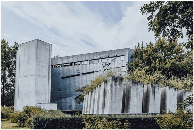 Отверстие старого здания покрывает стеклянная крыша, которую поддерживают стальные опоры. Внешне складывается впечатление сооружения с большим количеством острых углов, что выделяет его среди других. Автор проекта пытался передать чувство дезориентации и изоляции, которые пережили евреи во времена правления нацистов. Отдельный зал отведен под постоянную выставку, где классические презентации сочетаются с арт-инсталляциями, интерактивными элементами и компонентами виртуальной реальности.