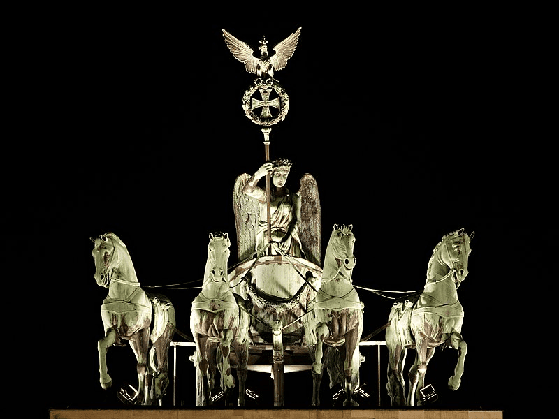 Головною скульптурою, як ви вже зрозуміли, є Квадрига (це колісниця запряжена 4-ма кіньми). Зразком для її створення став Галікарнаський мавзолей (до речі, одне з чудес світу). За задумом автора, цією колісницею керує римська богиня перемоги Вікторія, яка, так би мовити, в’їжджає у ворота миру в Берліні. До речі, німці не сприймали грецьку богиню перемоги Ніку чи миру Ейрену, вважаючи їх не сучасними та такими, що не відповідають задуму проєкту. А тому лише римська богиня могла зайняти це місце. На думку істориків, Вікторія в цьому образі забезпечувала Фрідріху Вільгельму легітимність його військових дій та бажання об’єднання в союзі німецьких держав.